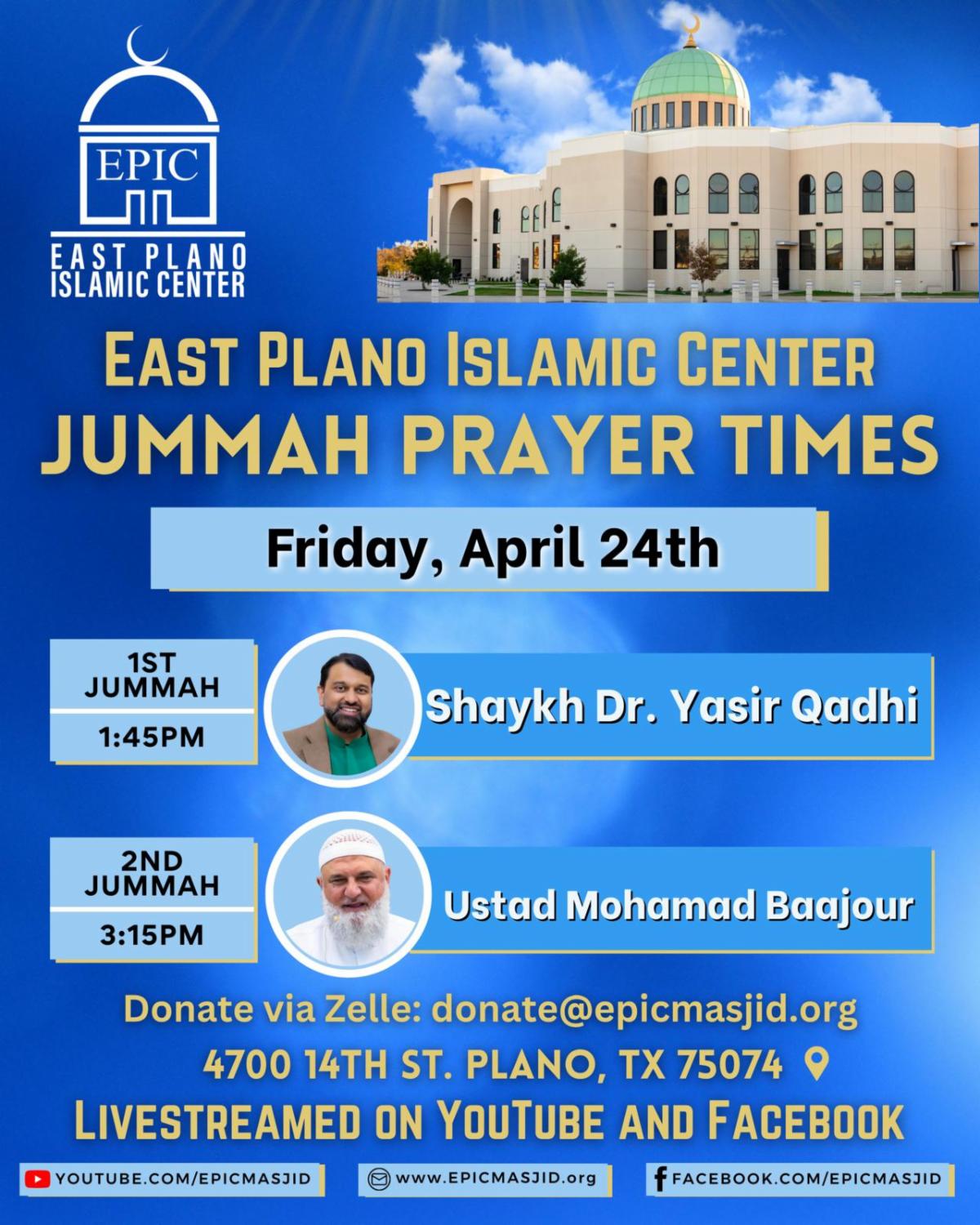 1st Jummah khutbah at EPIC Masjid on Friday, Apr 24, 2026 at 1:45 PM. Imported from EPIC Friday Announcements.