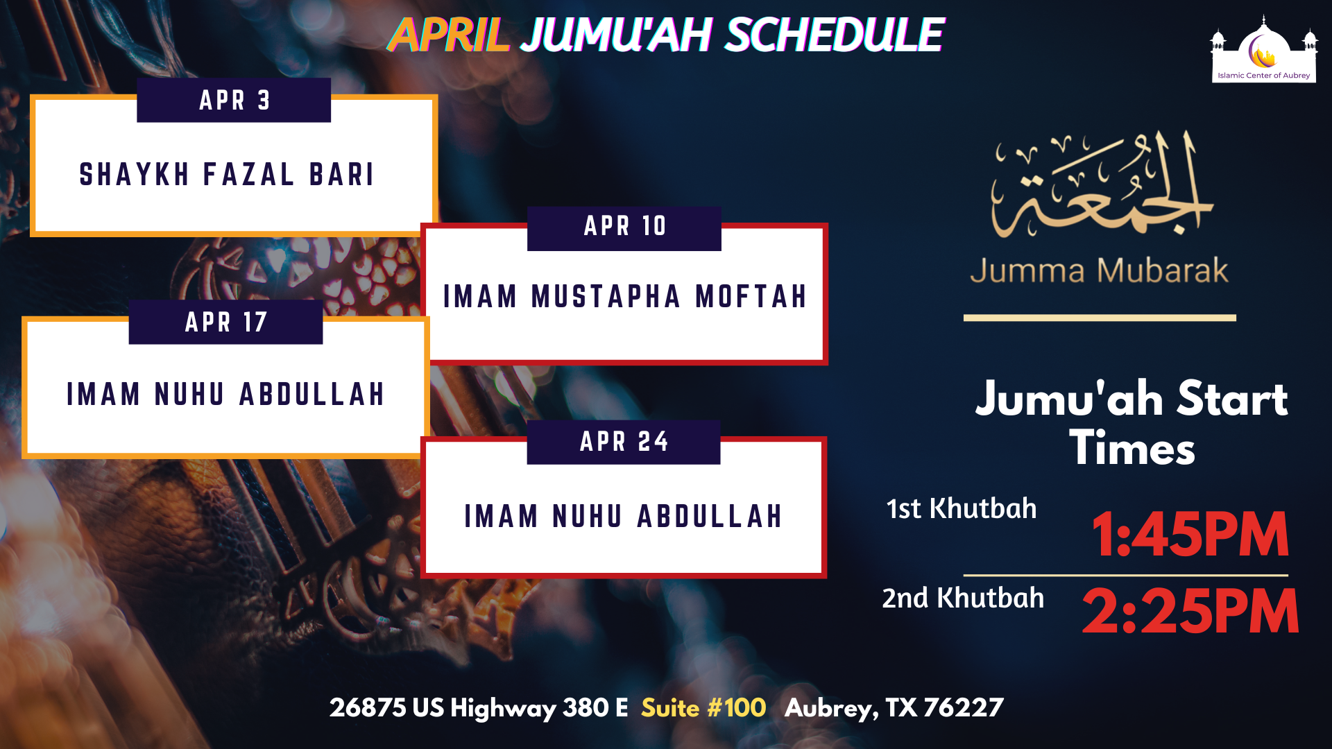 Location: Islamic Center of Aubrey, 26875 US Highway 380 E, Suite 100, Aubrey, TX 76227.