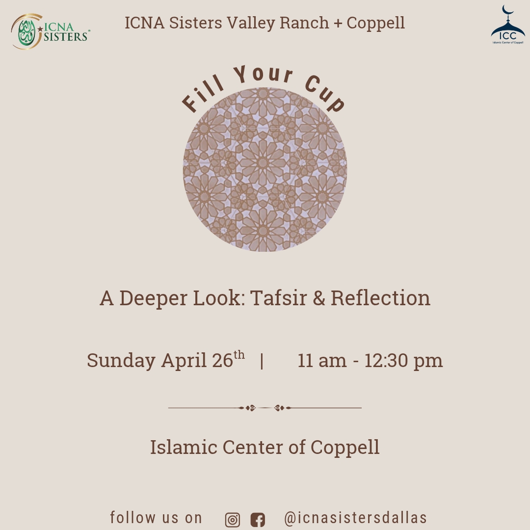 ICNA Sisters Valley Ranch + Coppell program on Sunday, April 26 from 11:00 AM to 12:30 PM at the Islamic Center of Coppell.