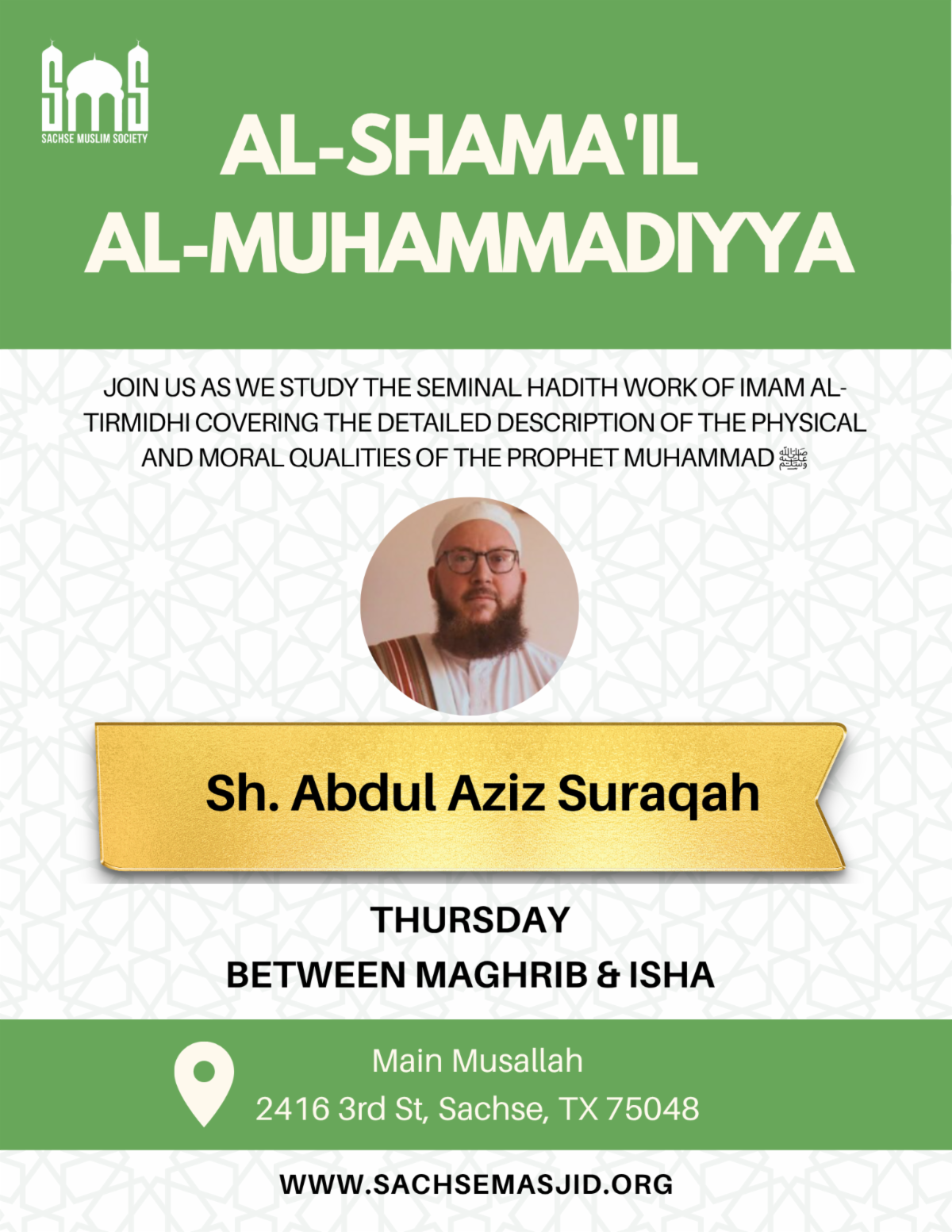 Join SMS as we study Al-Shama'il Al-Muhammadiyya by Imam al-Tirmidhi.