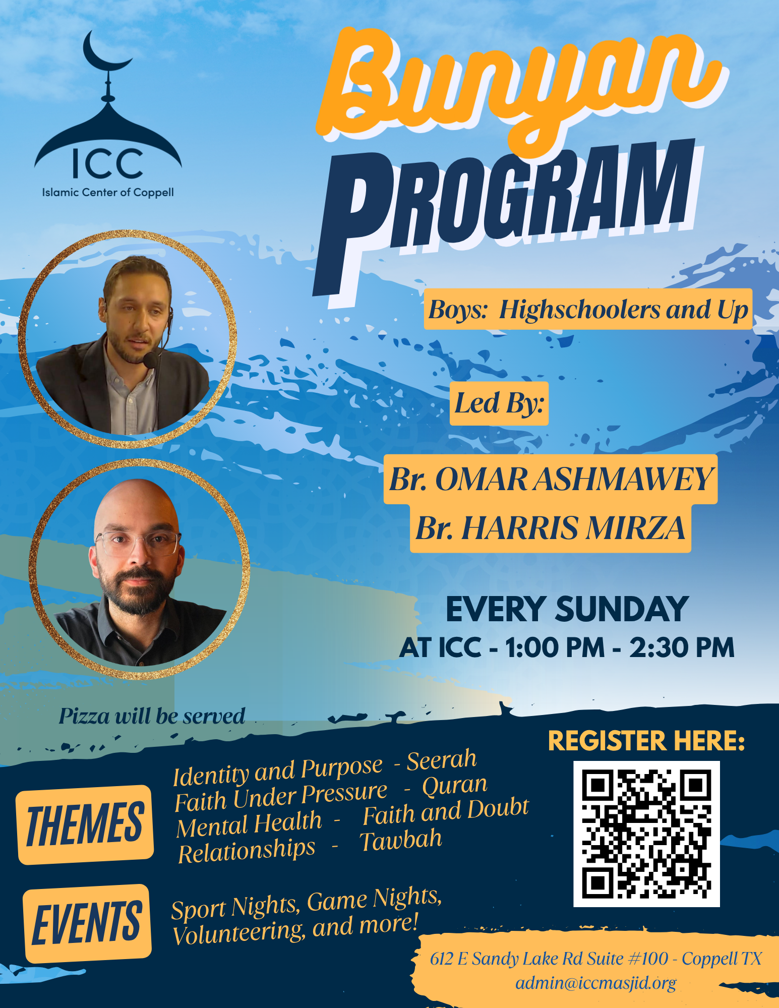 Youth boys program for high schoolers and up every Sunday from 1:00 PM to 2:30 PM at ICC, led by Br. Omar Ashmawey and Br. Harris Mirza.