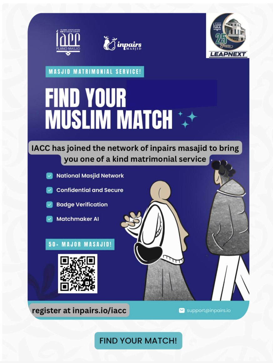 IACC (Plano Masjid) has joined the network of inpairs masaajid to bring you a one-of-a-kind matrimonial service.