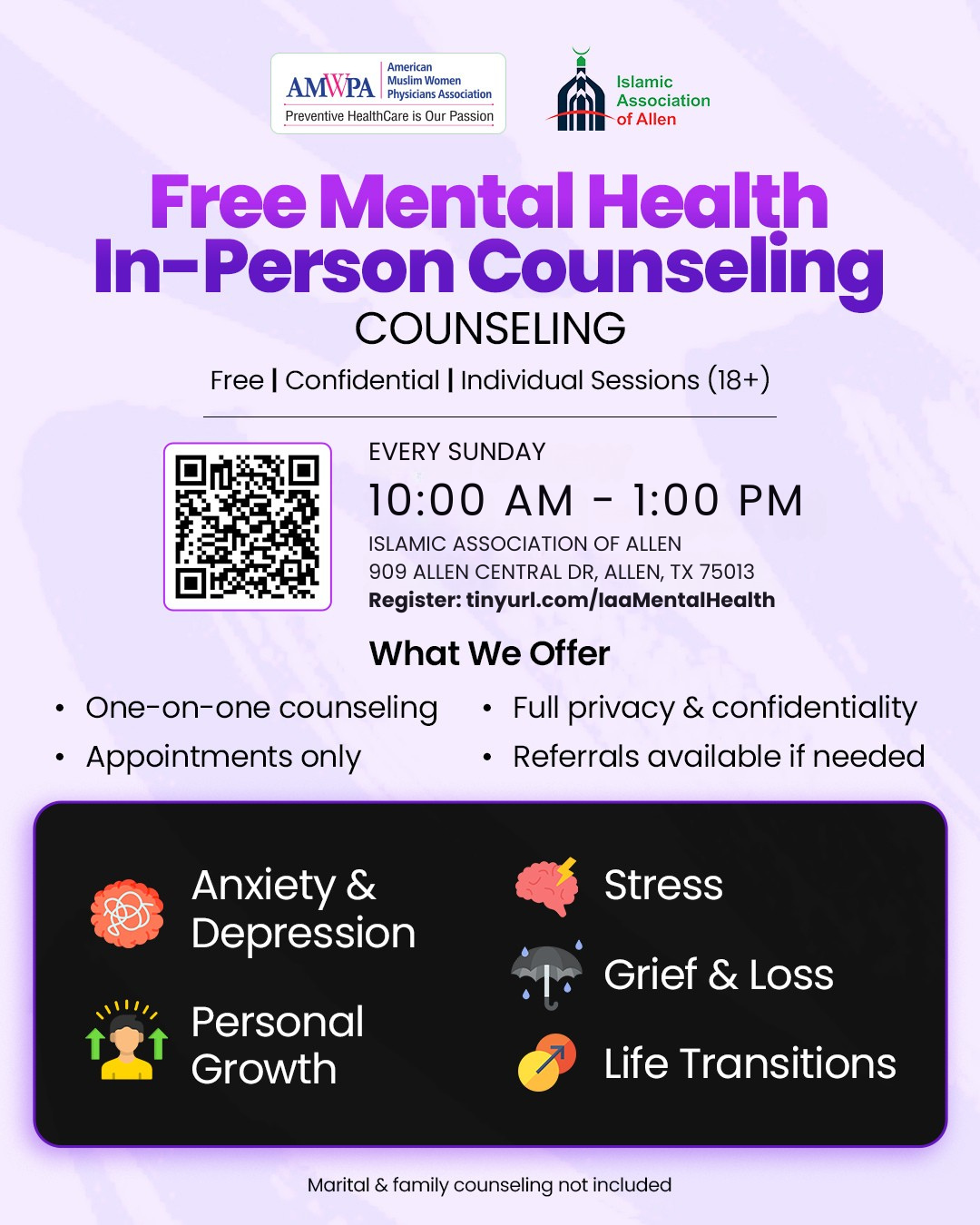 Register: https://allenmasjid.com/iaa-free-mental-health-counselling/ (flyer also shows tinyurl.com/iaaMentalHealth).