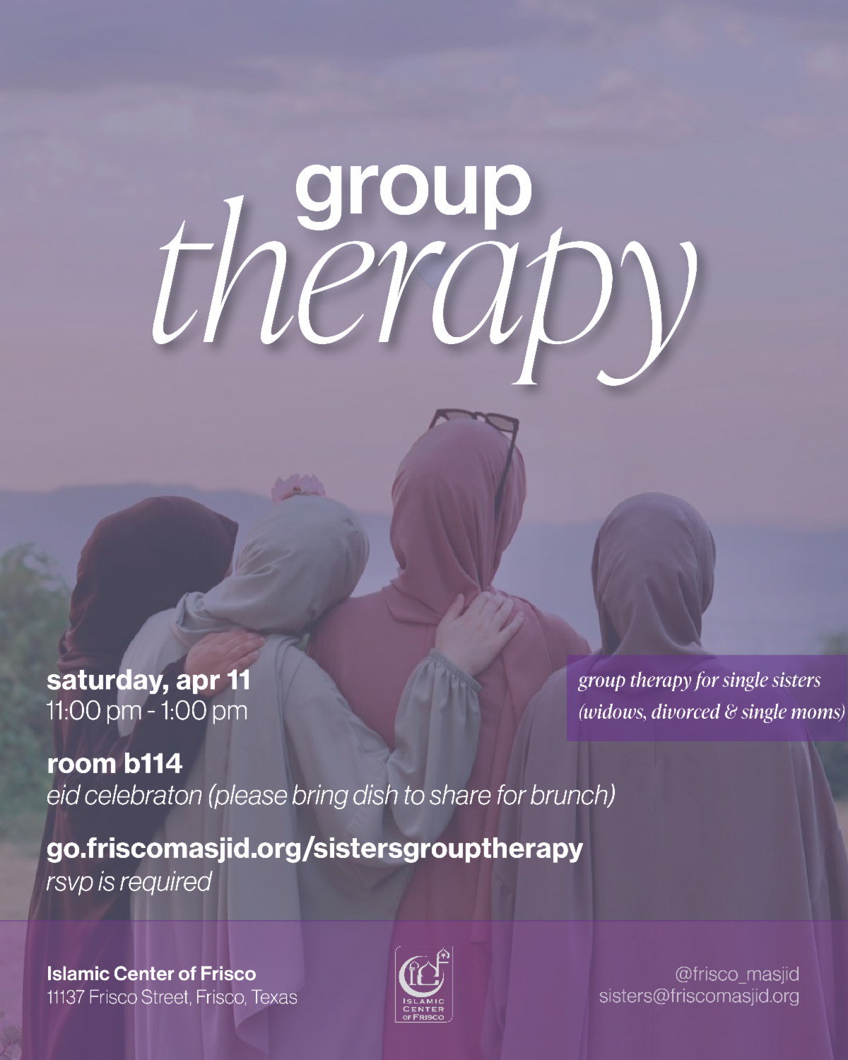 Bring a dish to share for brunch. RSVP required: https://go.friscomasjid.org/sistersgrouptherapy