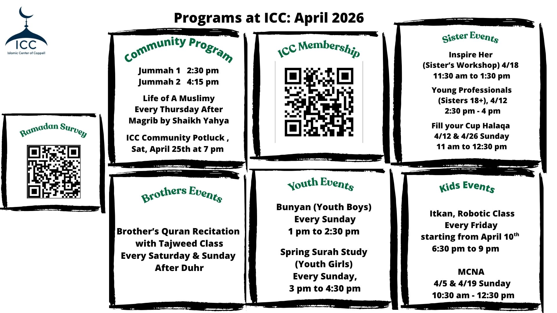 Location: Islamic Center of Coppell (ICC), 612 E Sandy Lake Rd #100, Coppell, TX 75019.