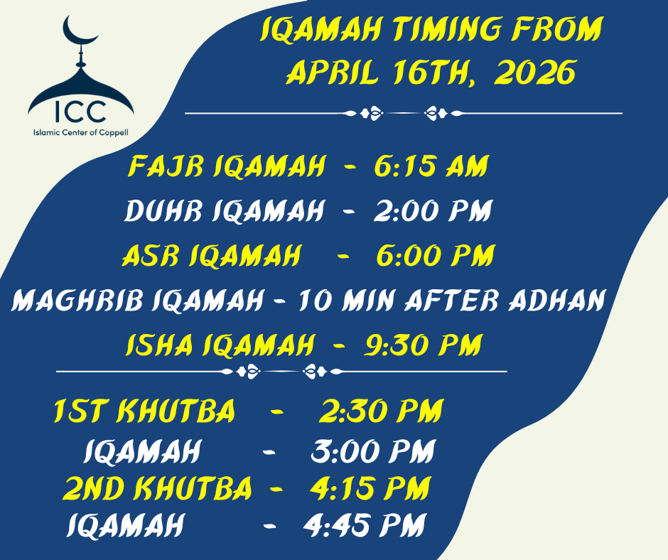 ICC newsletter note: starting from May 1, the 2nd Jummah khutbah will be at 4:30 PM and iqamah at 4:50 PM.