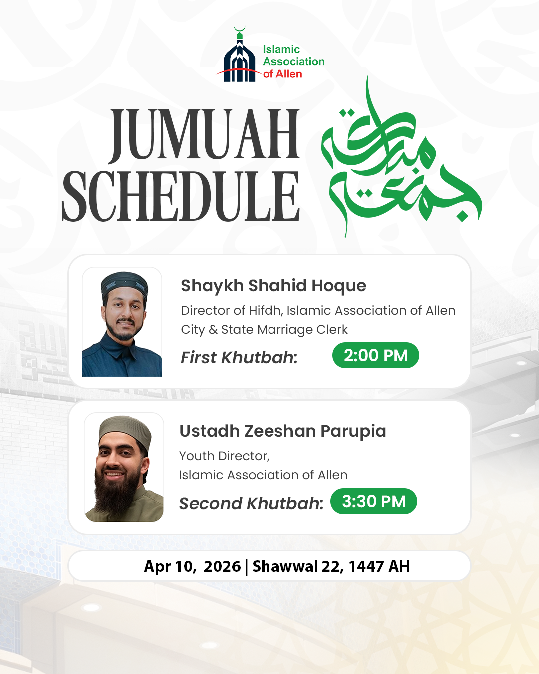 2nd khutbah: 3:30 PM (Ustadh Zeeshan Parupia).