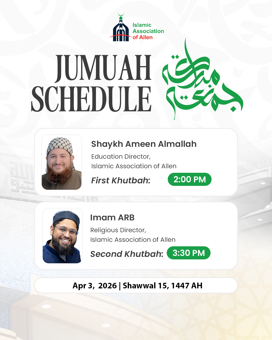 Second Khutbah: 3:30 PM — Imam ARB (Religious Director).