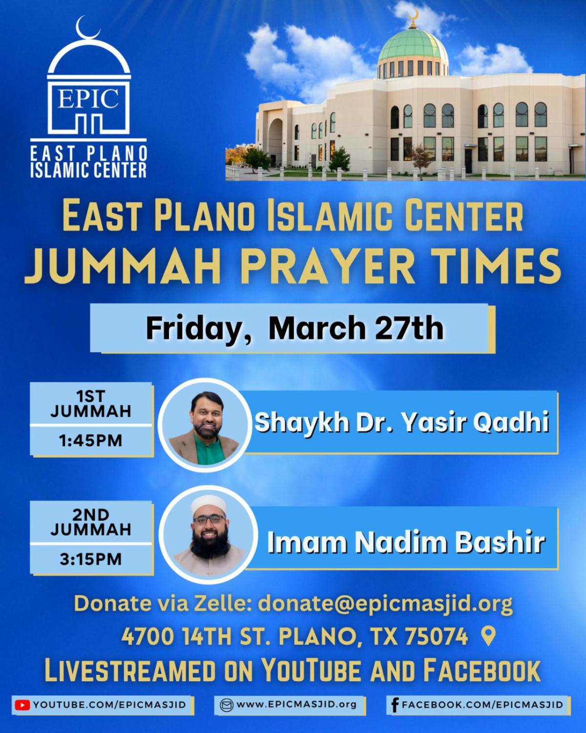 Location: EPIC Masjid (East Plano Islamic Center), 4700 14th St, Plano, TX 75074.