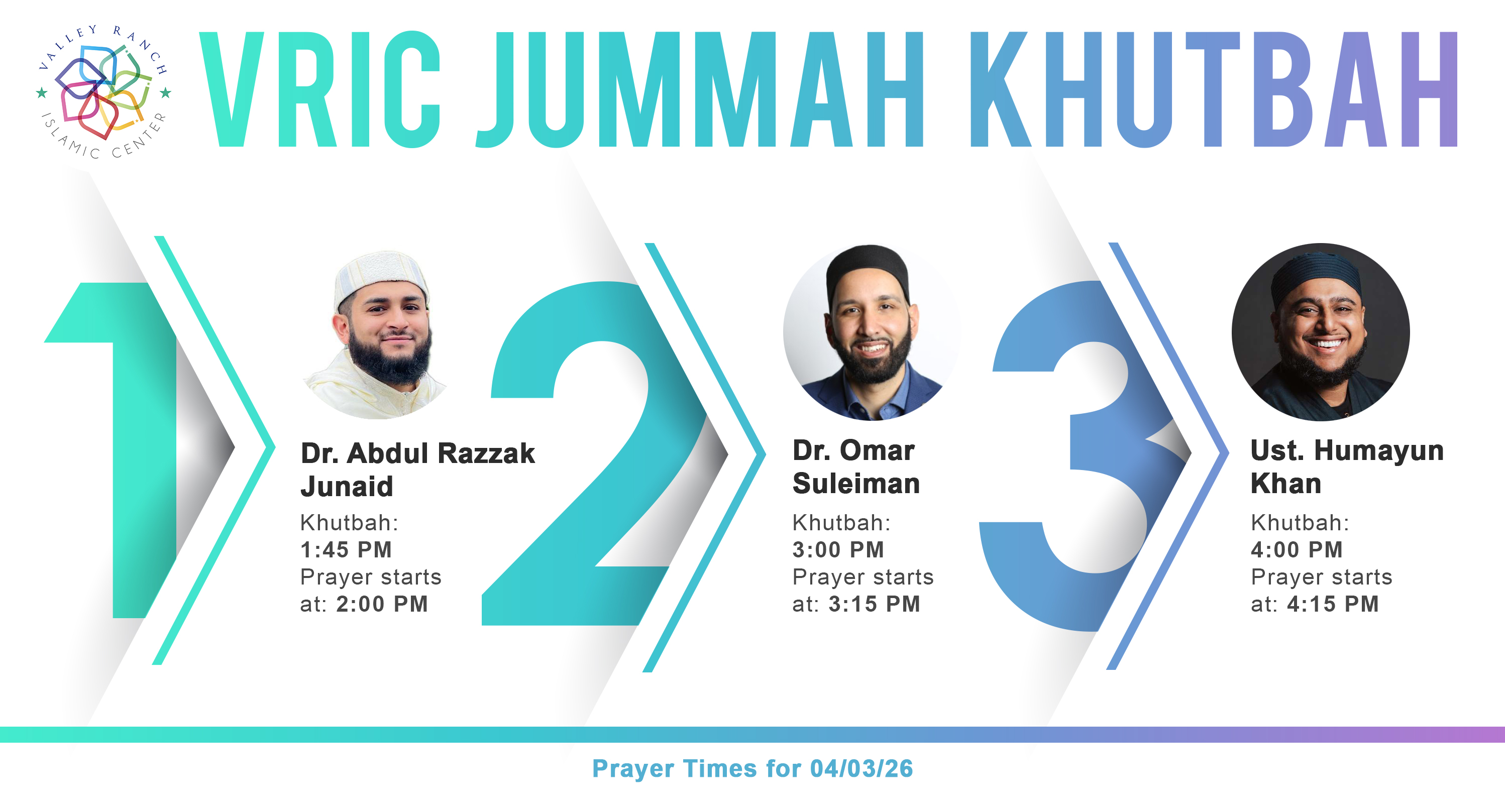 VRIC Jummah schedule (Fri, April 3, 2026).