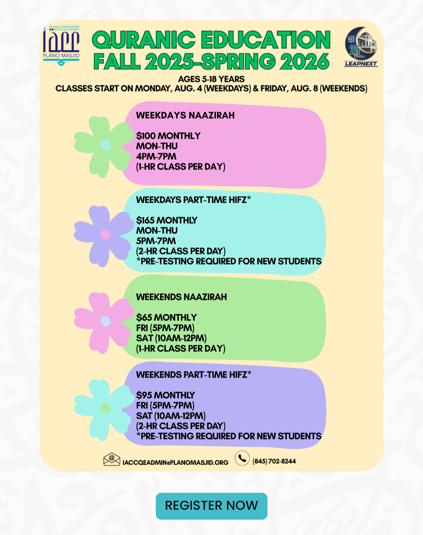 Quranic Education (Fall 2025–Spring 2026) — Weekdays (Mon–Thu)