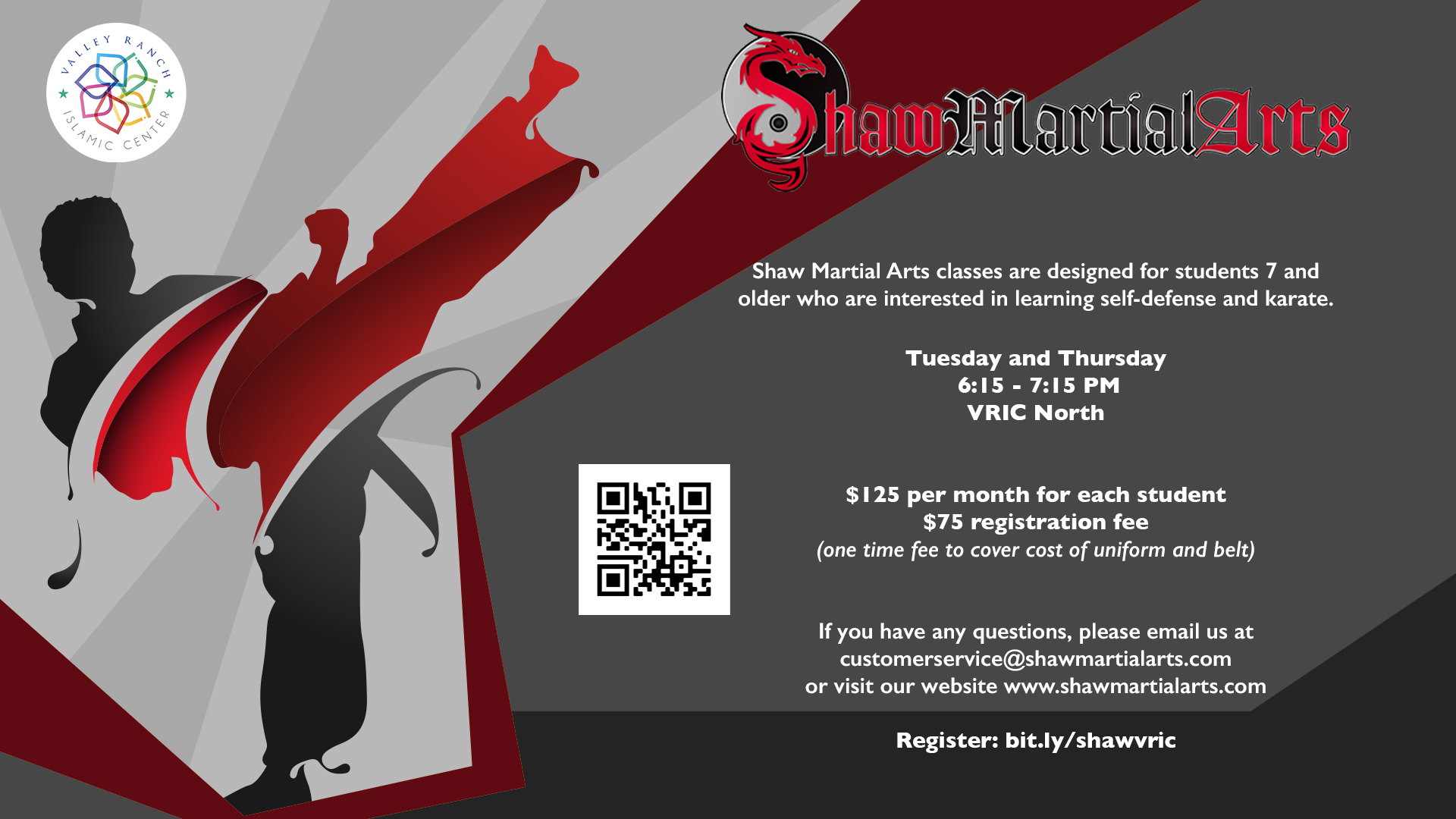 Shaw Martial Arts classes (self-defense and karate) for students 7 and older.