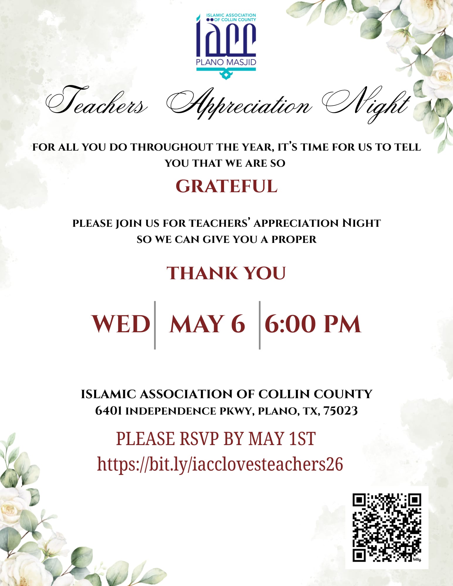 Teachers’ Appreciation Night at the Islamic Association of Collin County. Wednesday, May 6. RSVP requested by May 1. Extracted from the Apr 24, 2026 IACC Weekly Newsletter.