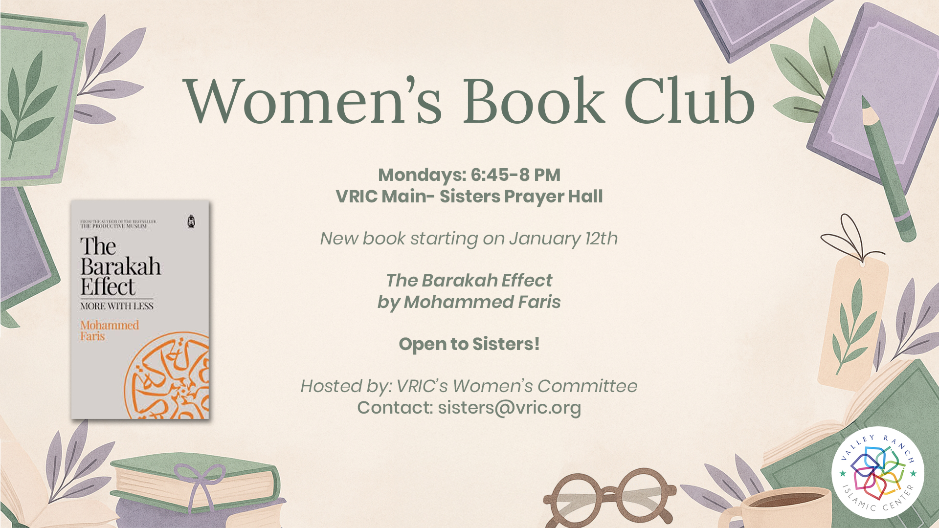 Open book club for sisters currently reading The Barakah Effect by Mohammed Faris.