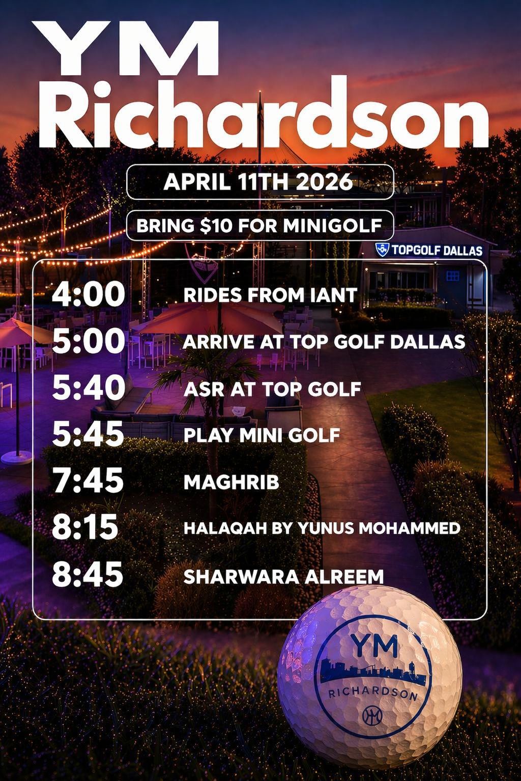 YM Richardson Outing: Topgolf Dallas Minigolf + Halaqah